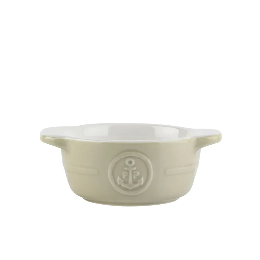 Ramekin fra Porsgrunds Porselænsfabrik måler 10 cm (indre mål 9 cm, med håndtak 13 cm i bredden) og passer perfekt til baking av porsjonsretter som crème brûlée og små gratenger. Den sylindriske formen gir en jevn steking, som gjør det enkelt å servere individuelle porsjoner.