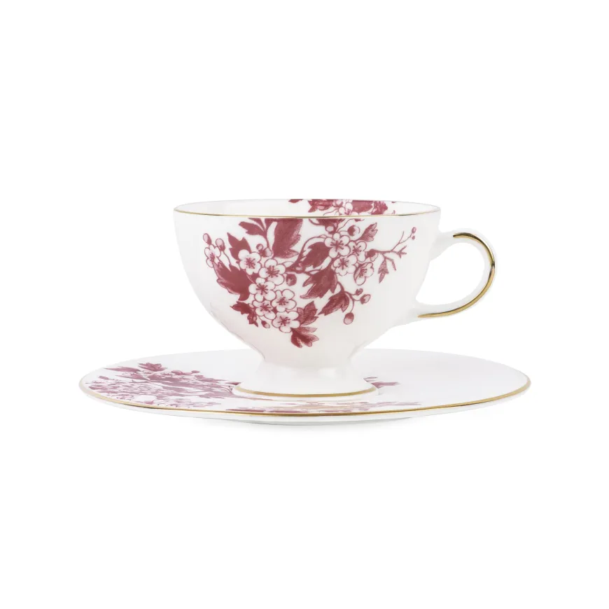 Kaffekoppen og skålen på 20 cl fra Porsgrunds Porselænsfabrik x byTiMo-kolleksjonen kombinerer vintage-inspirert design med en moderne, minimalistisk skål. Koppen har en diameter på 90 mm, og den vakre røde dekoren i burgund samt den håndmalte gullkanten gir et sofistikert preg. Skålen, med en diameter på 153 mm, er designet for å passe perfekt under koppen, og skaper en stilfull helhet til kaffestunden. Denne koppen passer like godt til en hyggelig kaffe foran peisen som på et vakkert dekket frokost- eller lunsjbord.