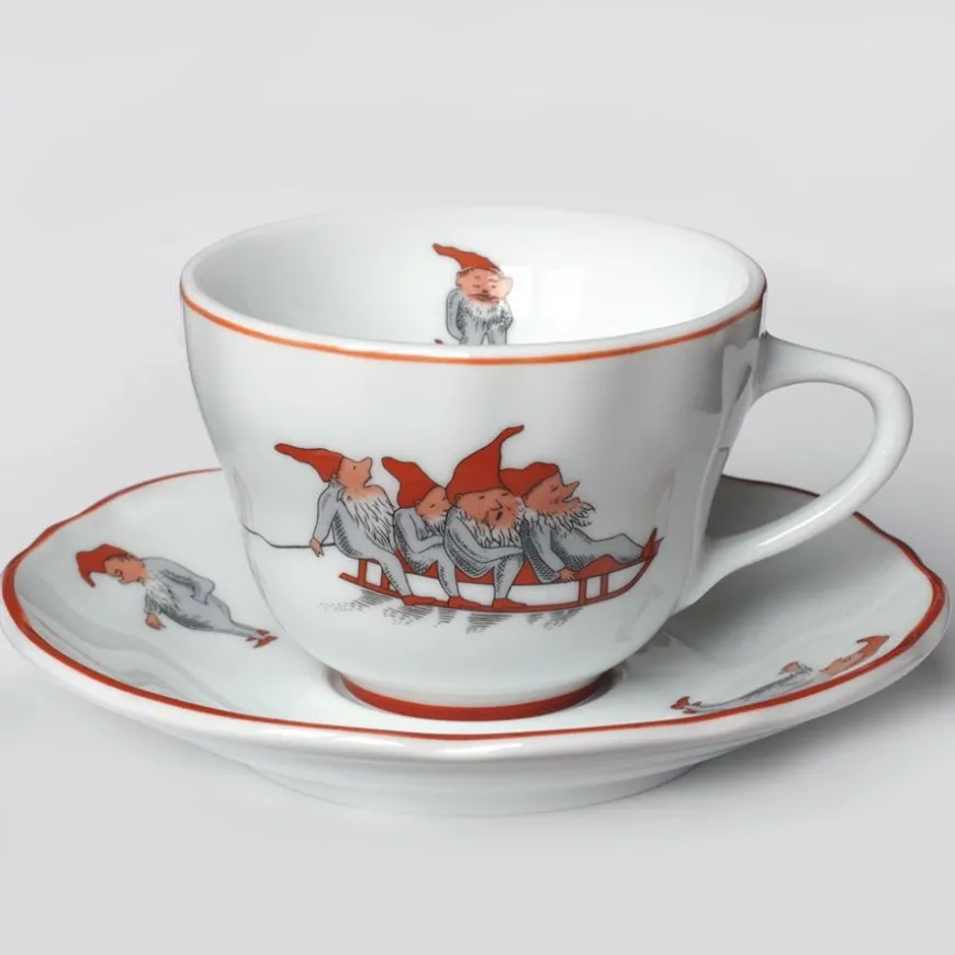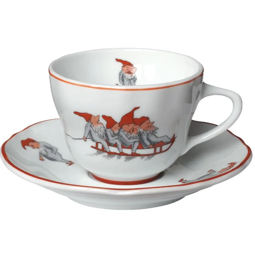 Koppen på 22 cl er en klassisk og fin kaffekopp, perfekt for en god kopp kaffe eller en liten kopp te. Den har en høyde på 6,55 cm, og skålen måler 14,1 cm i diameter. Denne søte koppen med skål passer perfekt inn i juleselskapet eller til daglig bruk. Nisseillustrasjonene gir et lekent preg som birdrar til ekstra stemning. Koppen kommer også i en litt mindre versjon på 15 cl, perfekt til en liten kaffetår eller en espresso.